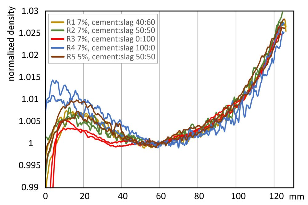 X-ray tomography revealed a vertically differentiated density structure in the CPB samples (Figure 4). The lower parts of all samples were denser in comparison with the upper parts of the specimens. The possible cause of this is probably connected to the compaction of solid particles in the base and upward injection of the liquid phase. More research is needed to determine why this phenomenon occurs and what consequences it has for the placement of CPB in mine voids. The porosity results obtained using X-ray tomography had two clear standouts. The sample with pure slag binder (R3) was by far the least porous, and the sample with pure cement binder (R4) was the most porous.