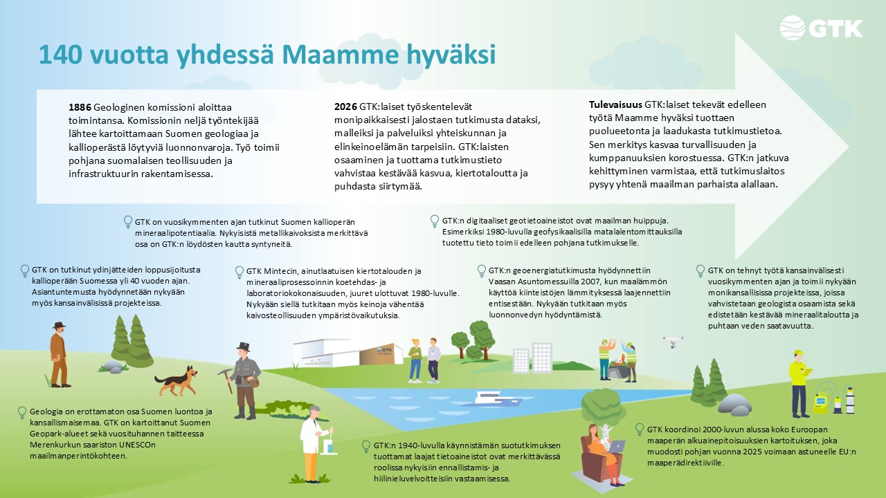 Geologian tutkimuskeskuksen 140-vuotisjuhlavuosi nostaa esiin tutkimuslaitoksen pitkän ja merkityksellisen matkan geologian asiantuntijana ja globaalisti vaikuttavana toimijana.