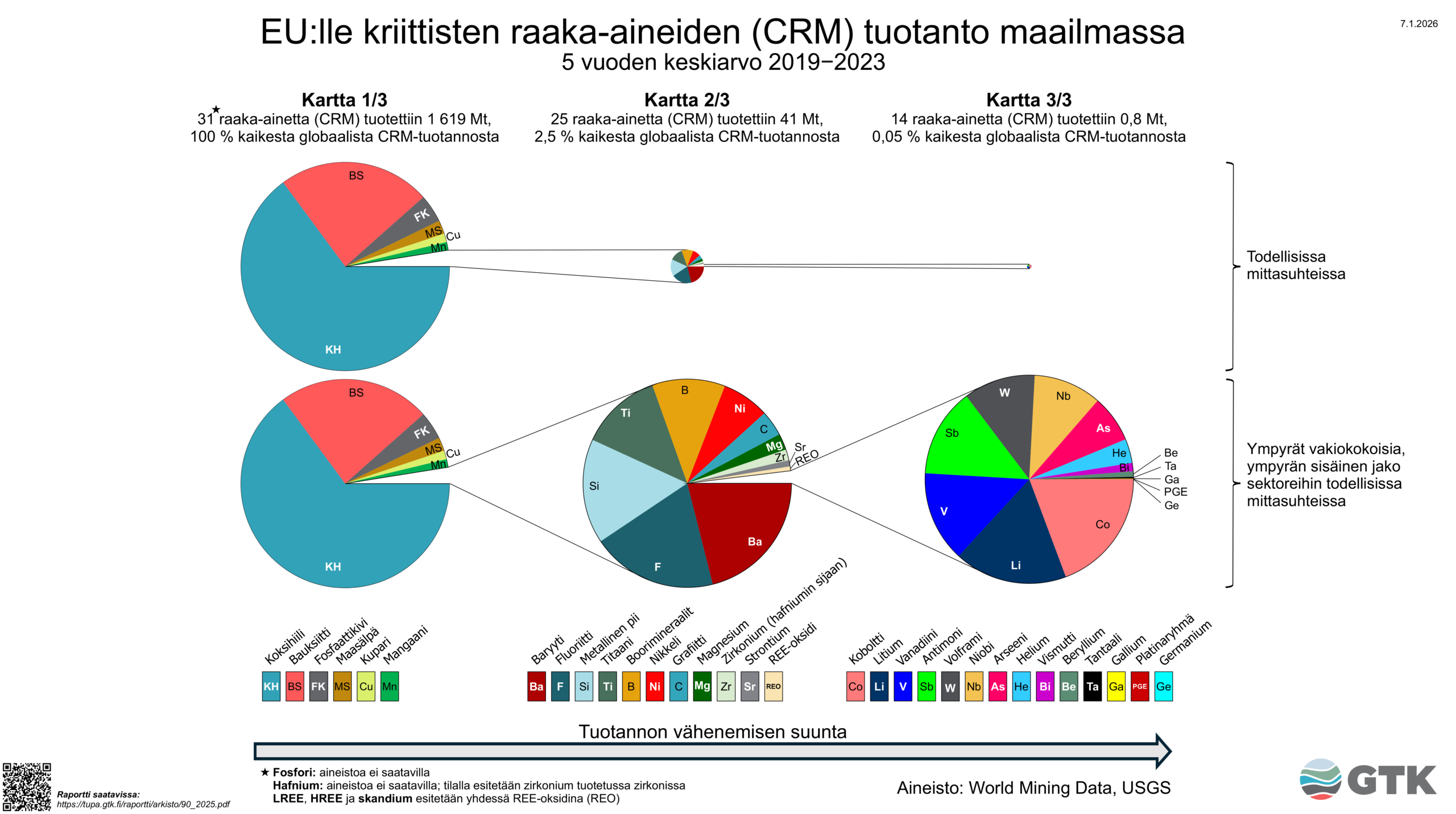 Pokki, J., Friedrichs, P. & Michaux, S. 2026. Global production of EU Critical Raw Materials: Visualising Accurate Tonnage Relations. Geological Survey of Finland, Open File Work Report 90/2025. 19 p., 5 app. pages. Raportti englanniksi