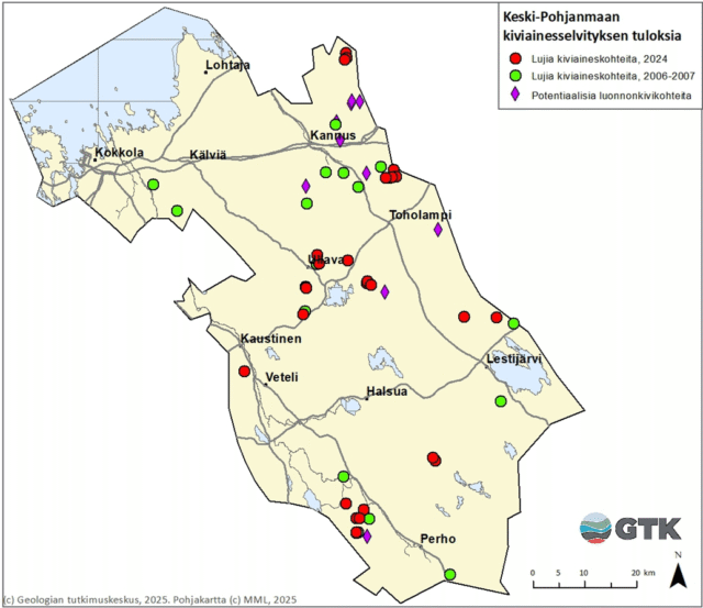 “Lujan kiviaineksen kohteita tunnistettiin yhteensä 25. Muutamat havainnoista osuivat myös suunniteltujen tuulivoimapuistojen alueille. Kokkolan kiviainesten kulutusalueelle ei tässä täydennyskartoituksessa kuitenkaan löydetty uusia lujan kiven kohteita. Luonnonkivikohteista esille nousivat harmaan porfyyrisen graniitin ja ns. mustan kiven alueet sekä yksi liuskekivikohde, joita voisi selvittää tarkemminkin”, kertoo projektipäällikkö Heidi Laxström GTK:lta.