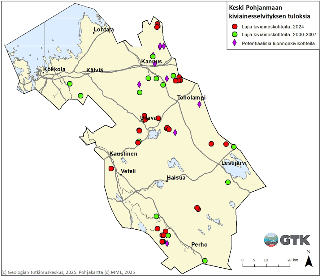 GTK tarkasteli Keski-Pohjanmaan alueelta yhteensä 120 kallioaluetta, joista havainnoitiin kivilajit ja niiden geologiset ominaisuudet sekä arvioitiin kiviaineksen mekaaninen lujuus ja potentiaali luonnonkivenä. Neljästä valitusta kohteesta otettiin testinäytteet, joille tehtiin laboratoriotestit ja petrografiset kuvaukset. Tuloksena löydettiin useita uusia, mekaaniselta kulutuskestävyydeltään lujia kiviaineskohteita, jotka keskittyvät erityisesti vulkaanisten kivilajien alueille maakunnan keski- ja eteläosissa.
