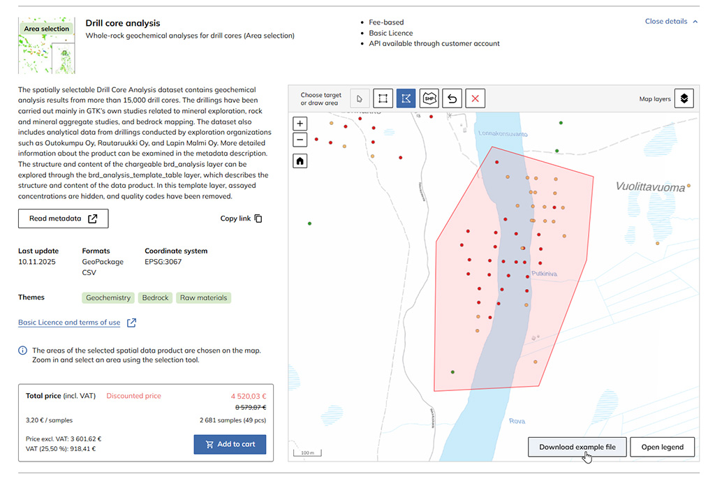 GTK has revamped the Spatial data products section in Hakku according to client feedback. The update enables users to select the spatial data to purchase themselves and to downloaded it faster than before. The first new products are available under Bedrock observations, Bedrock drilling and GTK Detailed till geochemistry data